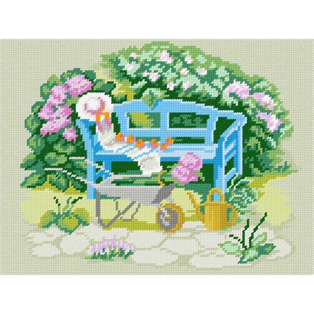 Characteristics of the set: Kit for embroidery yarn on canvas with a pattern Quick Tapestry TL-10 Wheelchair in the backyard